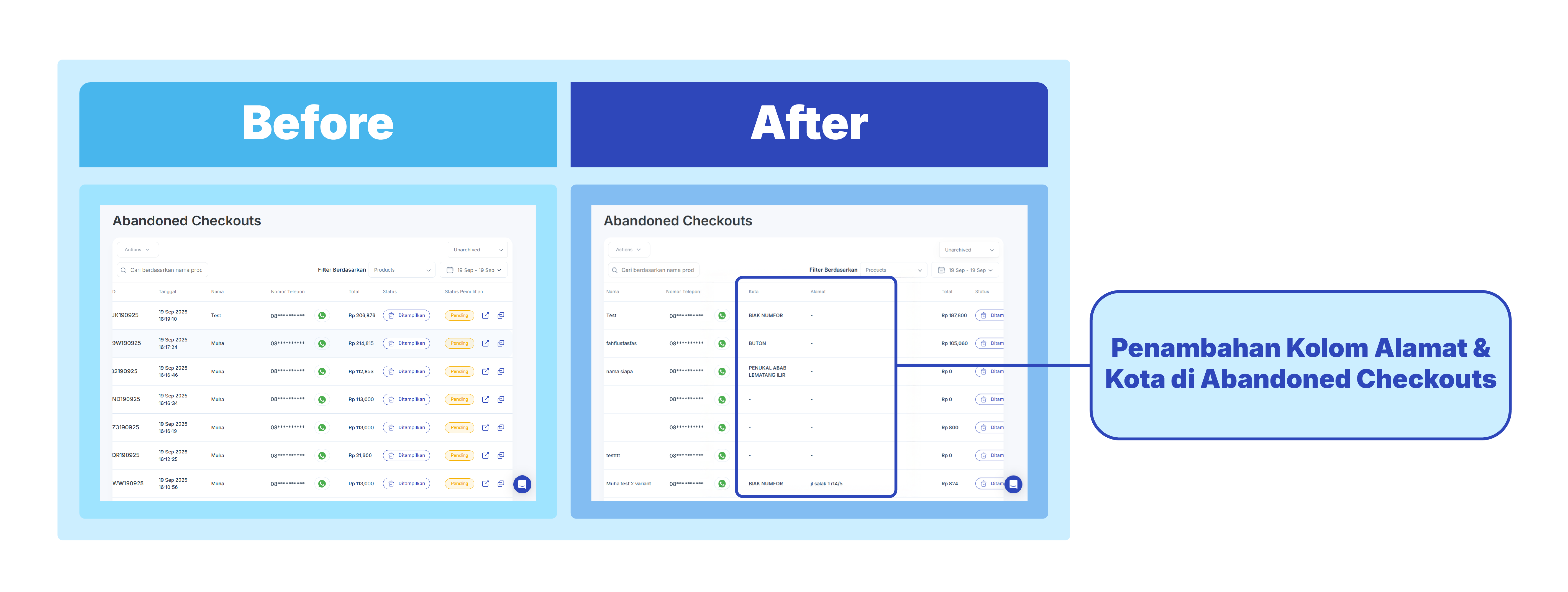 Begitu pembeli berhasil menyelesaikan order, sistem akan mencocokkan data berdasarkan produk dan nomor telepon. Kalau ternyata cocok, data abandoned-nya langsung dihapus otomatis.Jadi, follow up kamu tetap efisien, pembeli pun nggak terganggu.