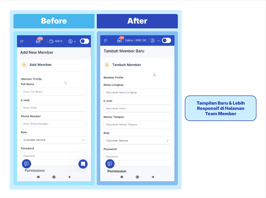 Sekarang halaman Tambah/Edit Team Member tampil dengan desain baru yang lebih segar dan nyaman diakses dari HP.